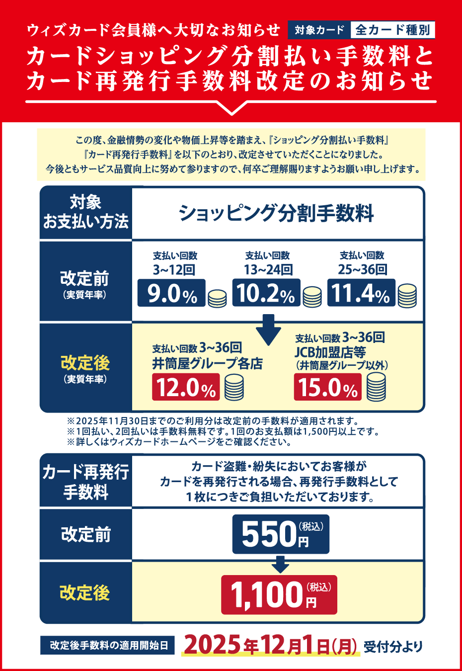 先般からのお知らせの通り2025年12月1日よりショッピング分割払い手数料率とカード再発行手数料を以下の内容で改定いたしました。