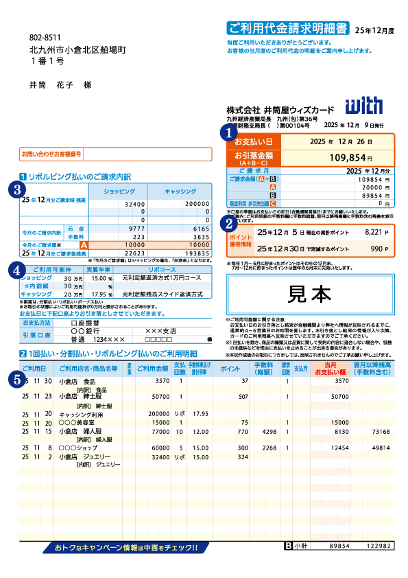 前月1日~前月末日までにご利用いただいたショッピング・キャッシングのご利用代金請求明細書です。